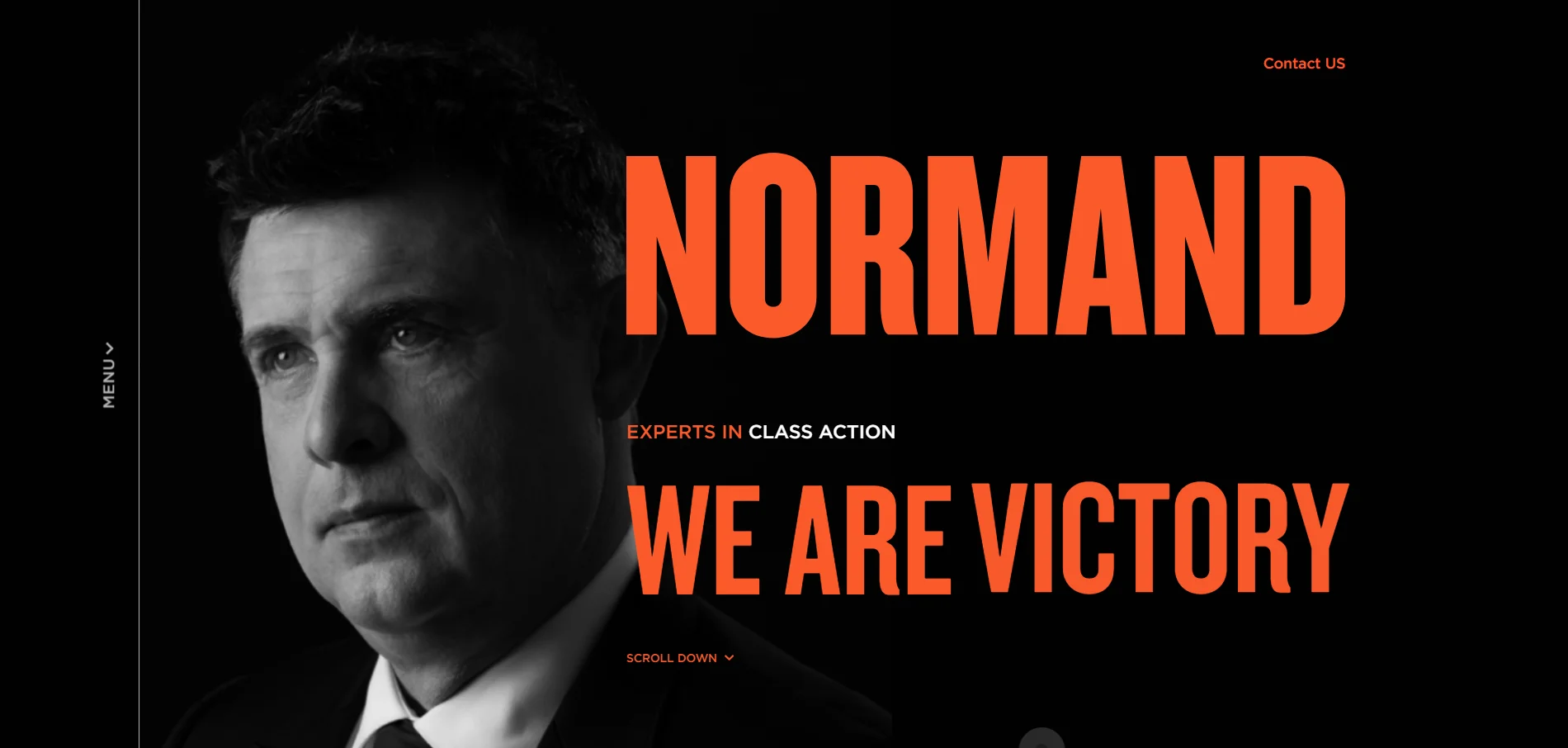 We’ve arrived at the NORMAND Law Firm website. Oh my goodness. Is that a lawyer or a superhero? Yes, that’s Normand. Extra bold Extra orange Extra black. Give me more! Victory, power. We try to avoid “advertisement” in law firm website designs. Advertising is banned in law firms in Europe and many other countries. However, if advertising weren’t prohibited, it wouldn’t be surprising if we opted for this design.