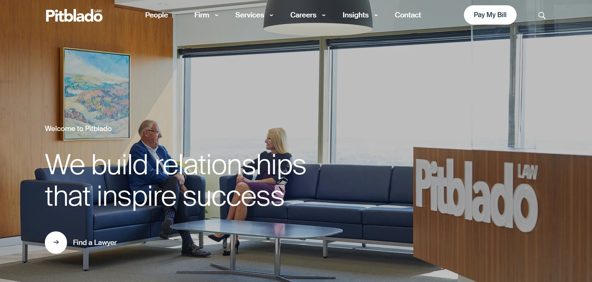 The Pitblado Law Firm homepage keeps it simple. Strong relationships, a plaza, expensive, rich leather chairs, and Pitblado. A warm welcome. The content is also very simple and well-designed. It offers a warmth within the corporate law firm design.